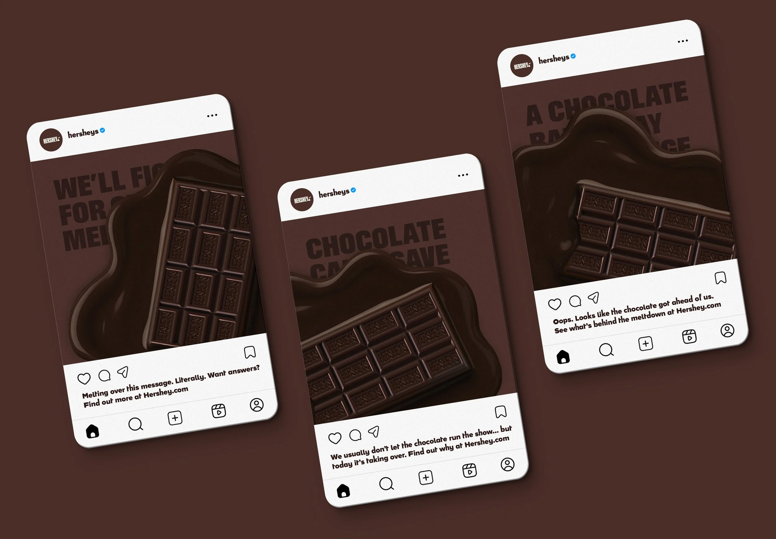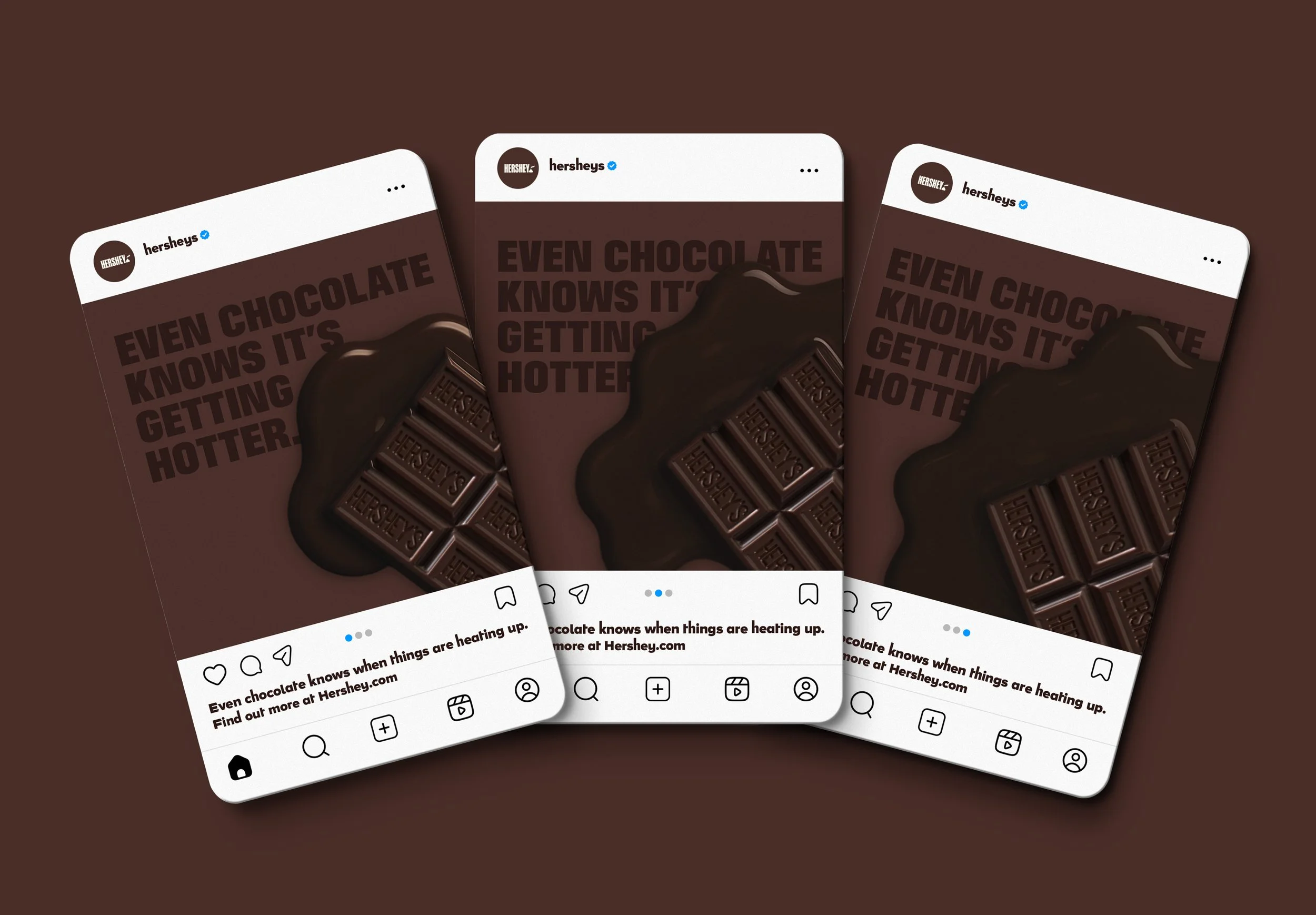 Execution: A limited-edition insulated wrapper launches as chocolate’s defense against the heat, supported by bold monochrome OOH and social with declarative copy and QR engagement. The idea extends into an immersive exhibit at Hershey Park to bring the platform to life.